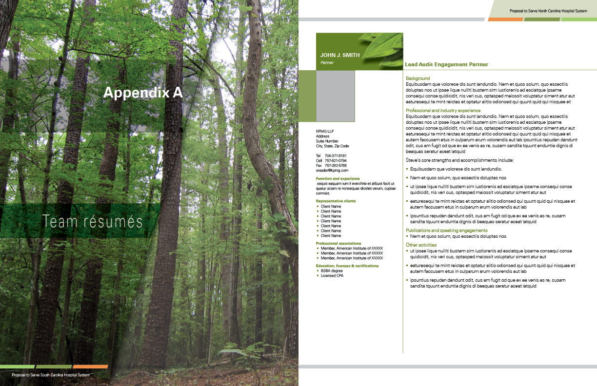 The pursuit team loved the idea and trusted the writer and myself to come up with a winning product, which we did. I balanced the use of imagery with maximizing content space. The hospital system is a client to this day.